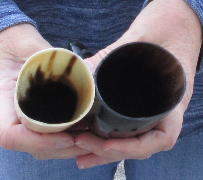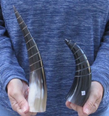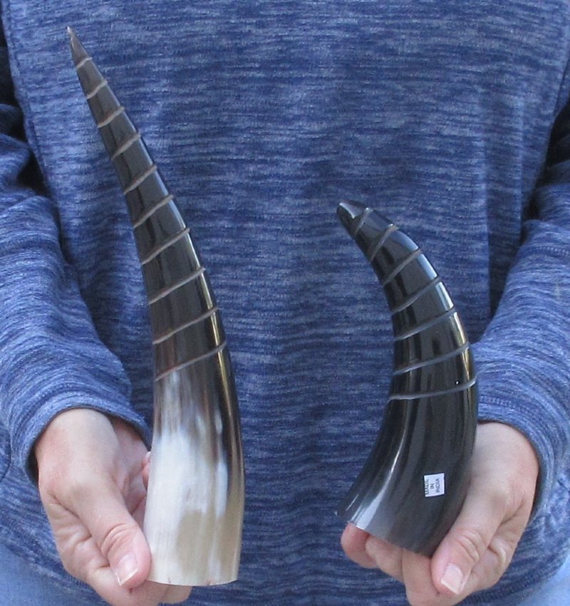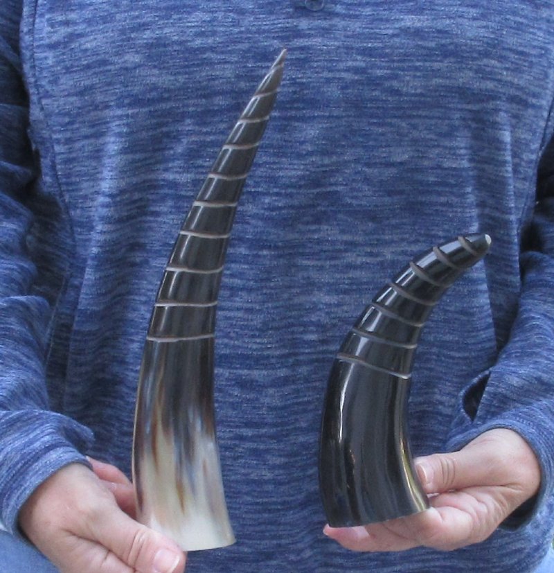 2 pc lot of Polished Spiral carved Cattle/Cow horns measuring approximately 12 inches and 8-3/4 inches, measured around the curve of the horn using a cloth tape measure - NOT straight with a wood rulerThe exterior of the cattle/cow horns are carved and polished.  The interior of the horns are not polished or carved.  Polished spiral carved cattle/cow horns are used for making animal horn jewelry, in cabin decor, rustic decorating, in making knife and cane handles, for carving, in the art of scrimshaw and in making inlaid instruments.