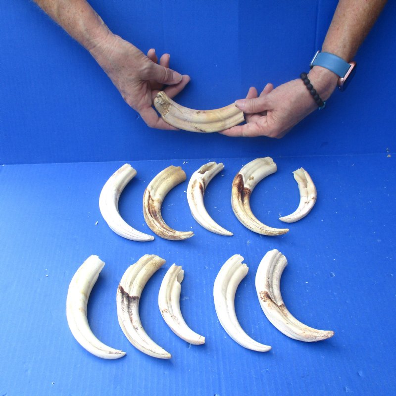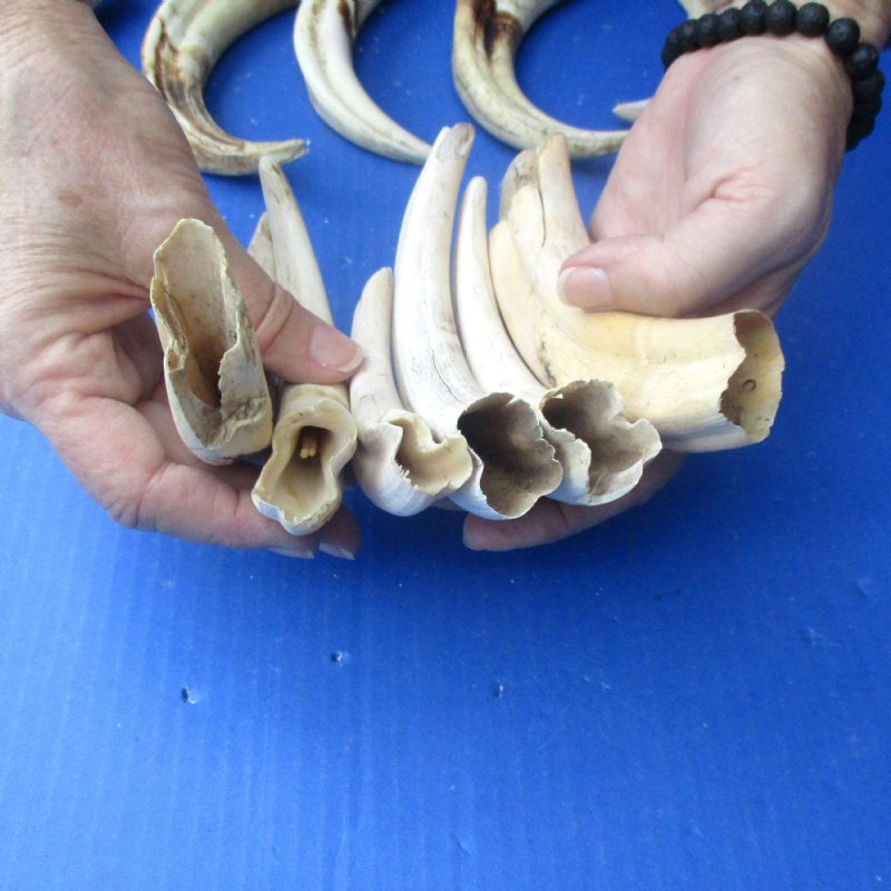 Two (2) pound of B-Grade warthog tusks, warthog ivory -  Assorted sizes approx. 4-8".  Some of the tusks may have cracks, discoloration, broken tips, or a drill hole, etc. - Review photos. Warthog tusks and warthog ivory are measured around the curve of the tusk using a cloth tape measure - NOT straight using a wood ruler. Warthog tusks and warthog ivory are used for carving, making handles, in the art of scrimshaw and in taxidermy crafts.