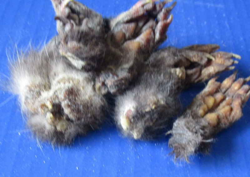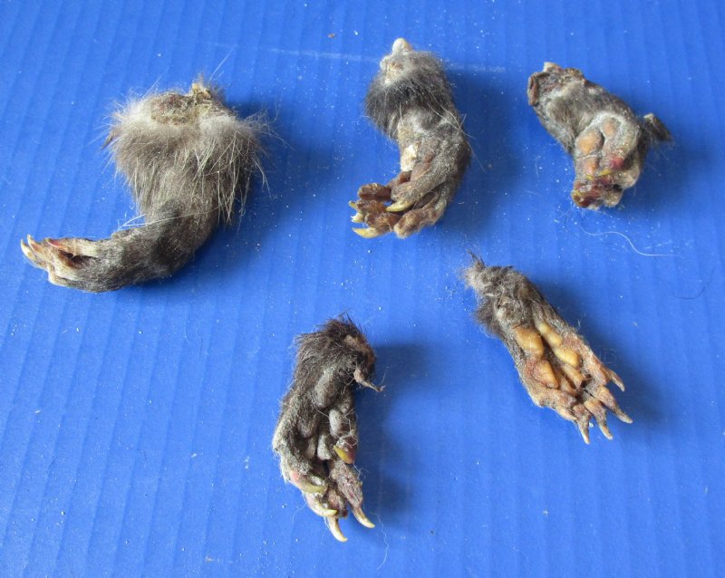 Wholesale North American Opossum feet which have been cured in Borax.  These opossum feet measure between approximately 2 inch to 3 inch in straight length. The feet will have an odor because they are a natural product and from the curing process. These feet are from a wild opossum and will have natural imperfections that would be found on all wild animals.