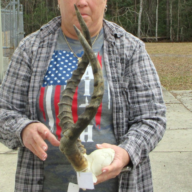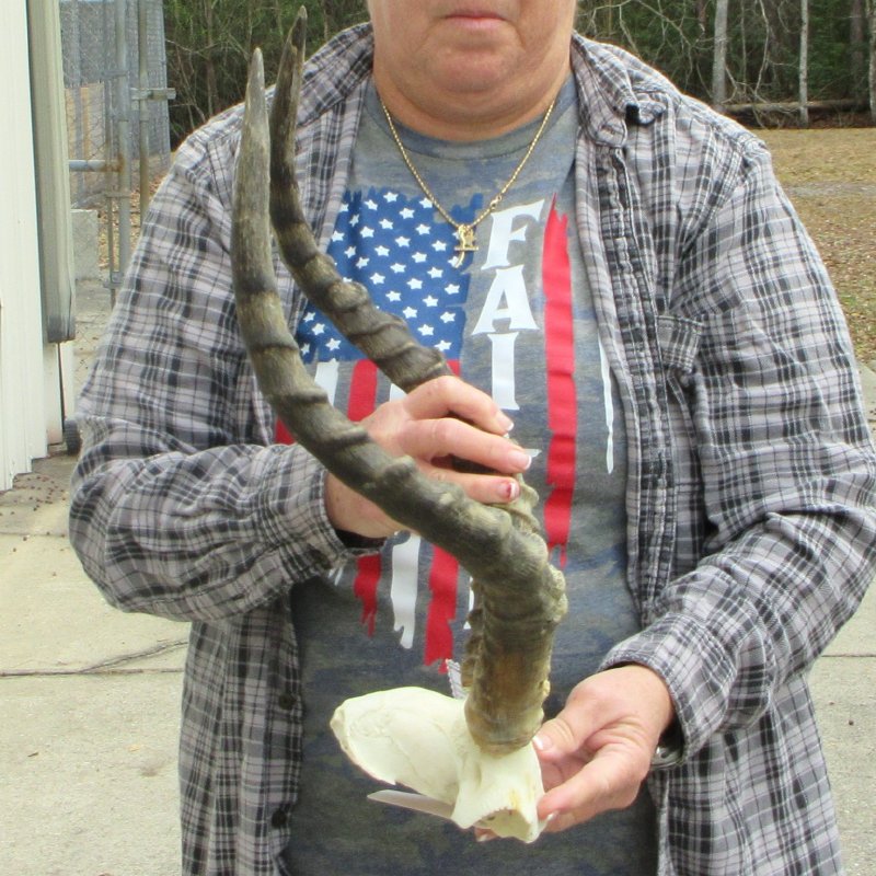 African Impala skull plate and horns for sale (Aeryceros melampus) for rustic cabin decor and African themed decorating.  The horns measure approximately 20 inches measured around the curve of the horns with a cloth tape measure, not straight up and down with a ruler.     - Damage to horn near base. Review all photos carefully as this is the one you are buying.   This skull plate and horns is from a wild African Impala and will have imperfections normally found on all wild Impalas from living in the wild, aging and fighting.