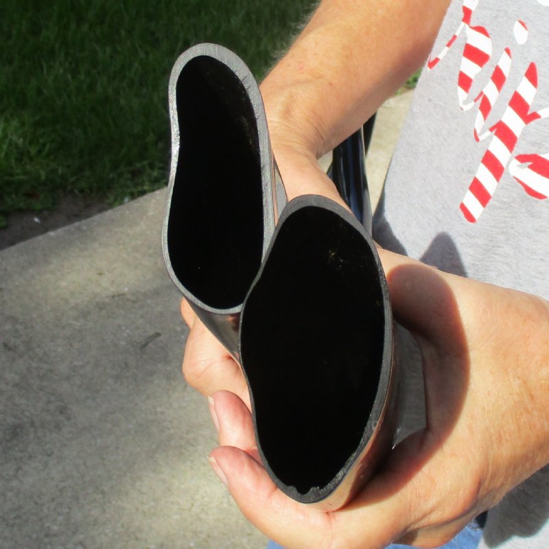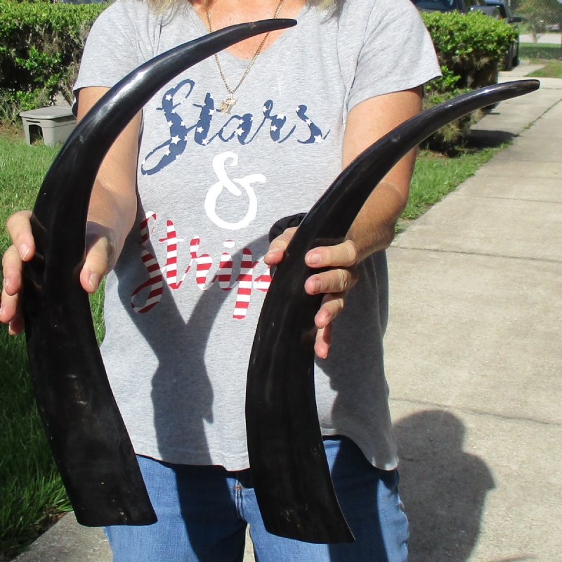 2 piece set of Polished, Black, Indian Water Buffalo Horns (Bubalus bubalis) for sale, measuring approximately 21 and 23 inches in length. These horns are measured around the curve of the horn with a cloth tape measure, not straight up and down with ruler. - Review all photos. Buffalo horns will vary in coloring, size, and shape. Some of these horns have a tiny patch at the tip of the horn where a tiny hole was drilled to release the pressure and allow removal of the inner bone. These may have a tag on them this is a requirement of the U.S Customs Department.  All products imported into the U.S must have a Country of Origin tag.