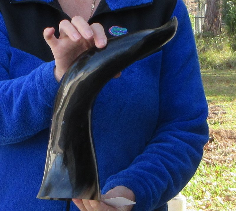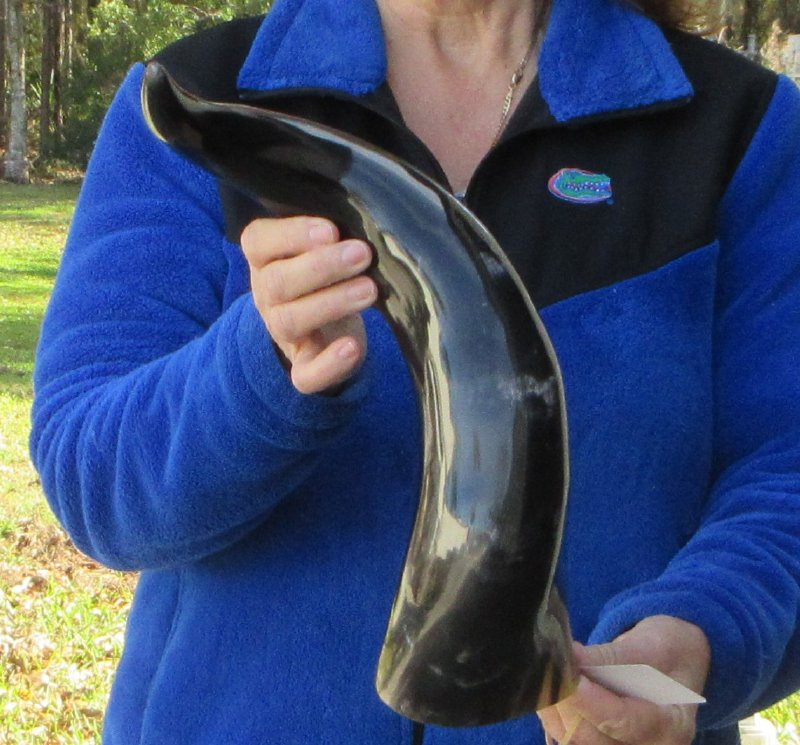 Polished Buffalo Horn with a Wide Base (Bubalus bubalis) for sale from an Indian Water Buffalo, measuring approximately 21 inches, measured around the curve of the horn using a cloth tape measure. The opening at the base of the horn is wide.  This horn may have some small, minor unfinished/rough areas. This horn does not stand unsupported. Our buffalo horns may have natural imperfections such as bubbles, indentations/divots, tiny pimples and surface cracks and scrapes. Review all photos.  Buffalo horns vary in coloring, size and shape and are used for making animal horn jewelry, in cabin decor, rustic decor, as knife handle material and for cane handles, for carving, in the art of scrimshaw and in making inlaid instruments. These may have a tag on them this is a requirement of the U.S Customs Department. All products imported into the U.S must have a Country of Origin tag.