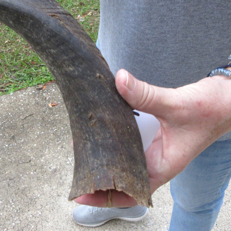 Kudu horn for sale (Tragelaphus angasi) imported from South Africa, measuring approximately 22-1/2 inch, measured around the curl of the horn - not straight. Splits at base of horn, gouge, and fraying. Review photos. Kudu horns are used in making shofars, blowing horns, kudu horn instruments, furniture legs, lamps, sconces, knife handles, cane handles, inlaid crafts and numerous other taxidermy crafts.