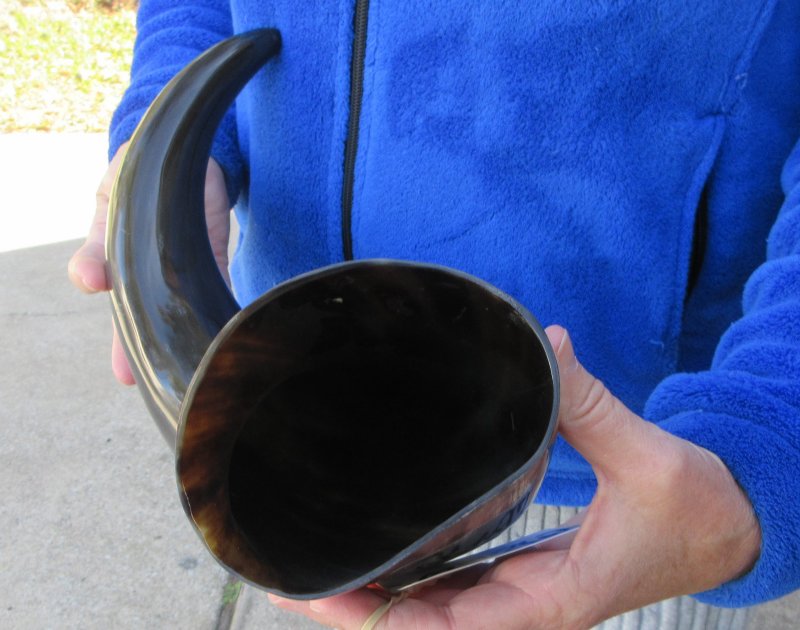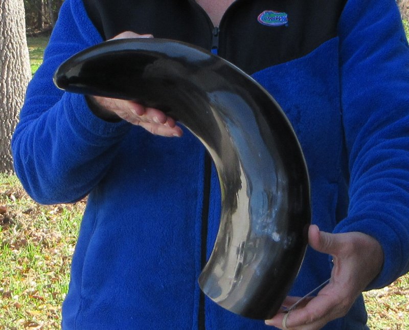 Polished Buffalo Horn with a Wide Base (Bubalus bubalis) for sale from an Indian Water Buffalo, measuring approximately 22 inches, measured around the curve of the horn using a cloth tape measure. The opening at the base of the horn is wide.  This horn may have some small, minor unfinished/rough areas. This horn does not stand unsupported. Our buffalo horns may have natural imperfections such as bubbles, indentations/divots, tiny pimples and surface cracks and scrapes. Review all photos.  Buffalo horns vary in coloring, size and shape and are used for making animal horn jewelry, in cabin decor, rustic decor, as knife handle material and for cane handles, for carving, in the art of scrimshaw and in making inlaid instruments. These may have a tag on them this is a requirement of the U.S Customs Department. All products imported into the U.S must have a Country of Origin tag.
