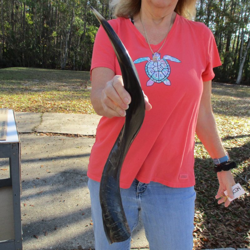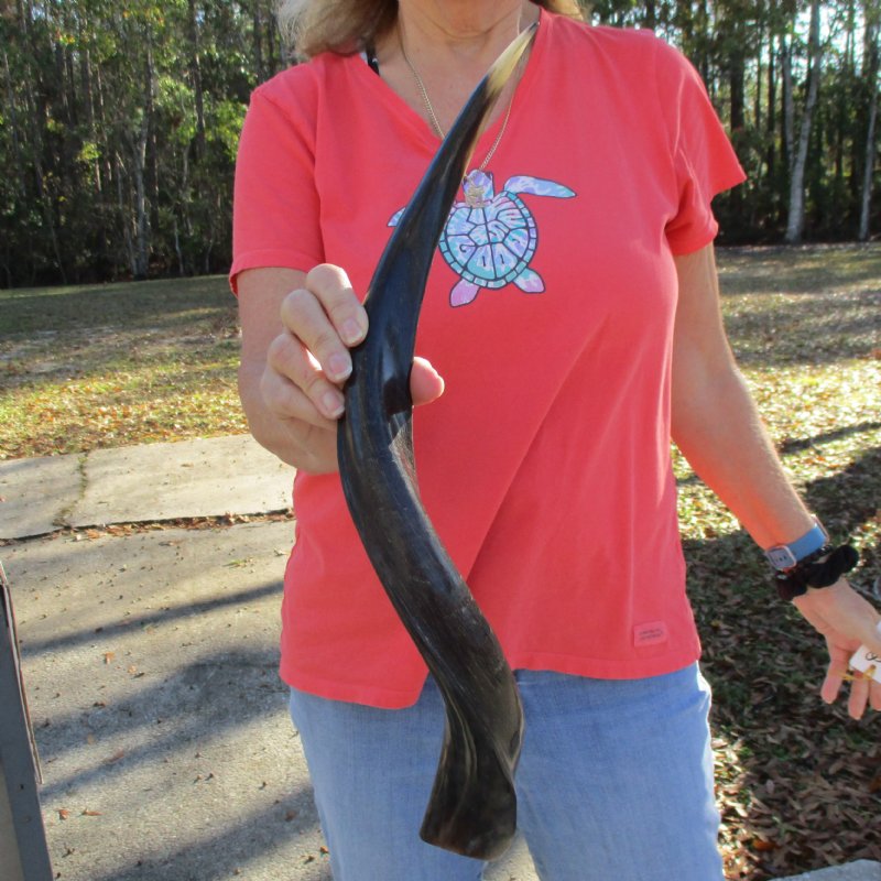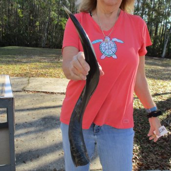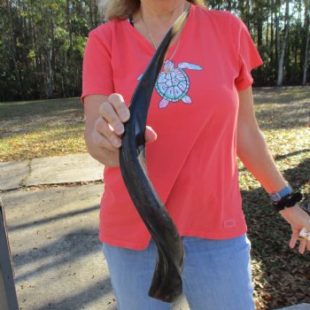 Polished Kudu Horn for sale (Tragelaphus strepsiceros) for sale imported from South Africa, measuring approximately 22 inches. - Review all photos. You will receive the horn shown in the photo. All horns are measured around the curve of the horn using a cloth tape measureAll of our horns are commercial grade and imperfect. They will have imperfections due to the natural aging process and living in the wild--scars, blemishes, rub areas, worm holes, etc. This horn was cleared by the U.S Fish and Wildlife Services and U.S Customs Services for legal entry into the United States. It was obtained from the African Government's Culling Program.