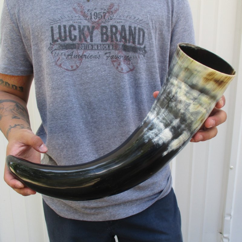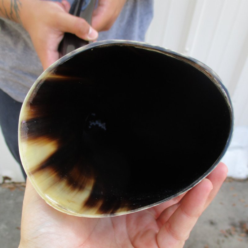 Polished Buffalo Horn with a Wide Base (Bubalus bubalis) for sale from an Indian Water Buffalo, measuring approximately 22 inches, measured around the curve of the horn using a cloth tape measure. The opening at the base of the horn is wide. - This horn may have some small, minor unfinished/rough areas. This horn does not stand unsupported. Our buffalo horns may have natural imperfections such as bubbles, indentations/divots, tiny pimples and surface cracks and scrapes. Review all photos.  Buffalo horns vary in coloring, size and shape and are used for making animal horn jewelry, in cabin decor, rustic decor, as knife handle material and for cane handles, for carving, in the art of scrimshaw and in making inlaid instruments. These may have a tag on them this is a requirement of the U.S Customs Department. All products imported into the U.S must have a Country of Origin tag.