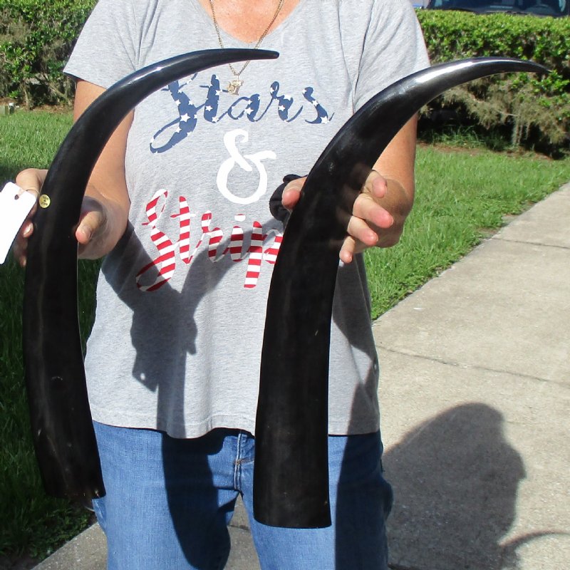 2 piece set of Polished, Black, Indian Water Buffalo Horns (Bubalus bubalis) for sale, measuring approximately 23 and 24 inches in length. These horns are measured around the curve of the horn with a cloth tape measure, not straight up and down with ruler. - Review all photos. Buffalo horns will vary in coloring, size, and shape. Some of these horns have a tiny patch at the tip of the horn where a tiny hole was drilled to release the pressure and allow removal of the inner bone. These may have a tag on them this is a requirement of the U.S Customs Department.  All products imported into the U.S must have a Country of Origin tag.
