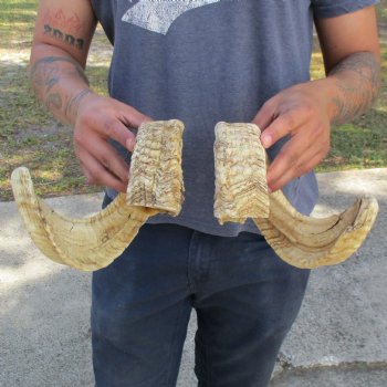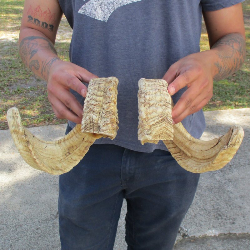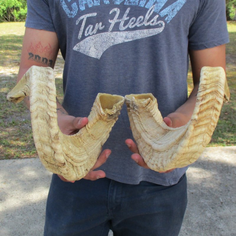 Matching pair of Sheep Horns, or Ram Horns (Ovis aries), measuring approximately 23 & 25 inches around the curl. Sheep horns and ram horns are measured around the curve of the horn - not straight. - Large sheep horns will have natural imperfections including, gouges, holes, splits, missing sections of top layer, etc. from aging and fighting. Review all photos. Ram horns and sheep horns are used in making blowing horns, furniture legs, lamps, sconces, knife handles, cane handles, inlaid crafts and numerous other taxidermy crafts. Our ram sheep horns are a by-product of the farming industry and Government culling programs. The ram sheep horns have been professionally cleaned in Africa and India and cleared for entry into the United States by the U.S. Fish and Wildlife Service and U.S. Customs.