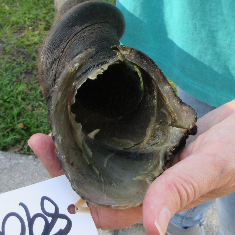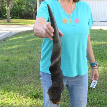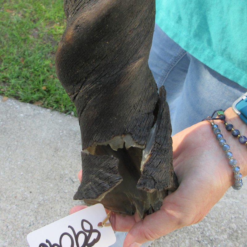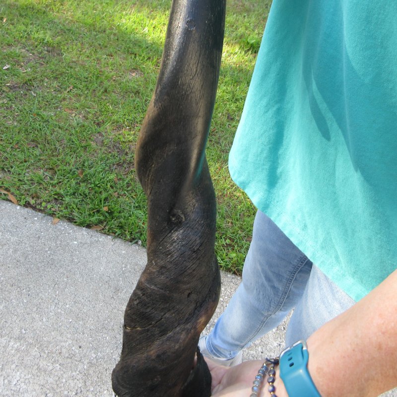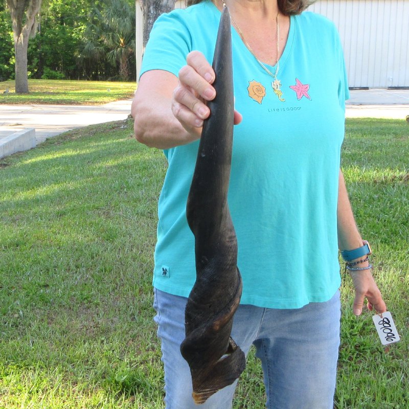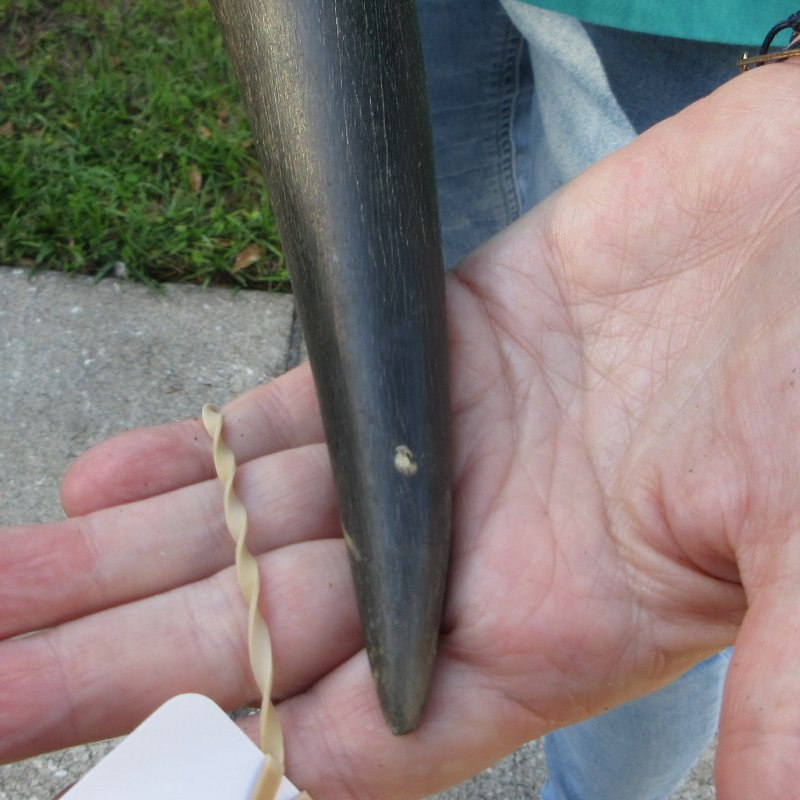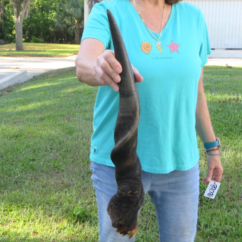 B-Grade Male Eland horn (Taurotragus oryx), measured around the curl, imported from South Africa. This eland bull horn measures approximately 24-1/2 inches (measured around the curl of the horn with a cloth tape measure, not straight up and down with a ruler).    Missing piece at base of horn, splits, and putty filled drill holes. Review all photos.  Eland horns are used in making blowing horns, eland horn instruments, furniture legs, lamps, sconces, knife handles, cane handles, inlaid crafts and numerous other taxidermy crafts.