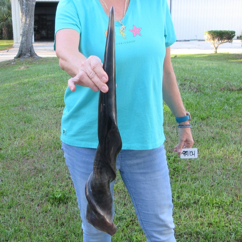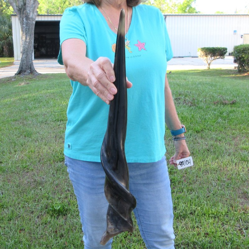 Polished Male Eland horn (Taurotragus oryx), measured around the curl, imported from South Africa. This eland horn measures approximately 24-1/2 inches long (measured around the curl of the horn with a cloth tape measure, not up and down with a ruler).  - Review all photos.  Eland horns are used in making shofars, blowing horns, eland horn instruments, furniture legs, lamps, sconces, knife handles, cane handles, inlaid crafts and numerous other taxidermy crafts.