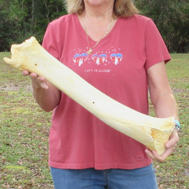 African Giraffe Tibia Leg Bone (Giraffa camelopardalis) for sale measuring approximately 24 inches long. This bone is from a real giraffe and will have imperfections such as cracks, tiny holes, fine lines and chipped edges. - Discoloration and holes in bone. Review all photos. Giraffe leg bones are used for carving, scrimshaw art, making bone knife handles, and for numerous other craft projects.