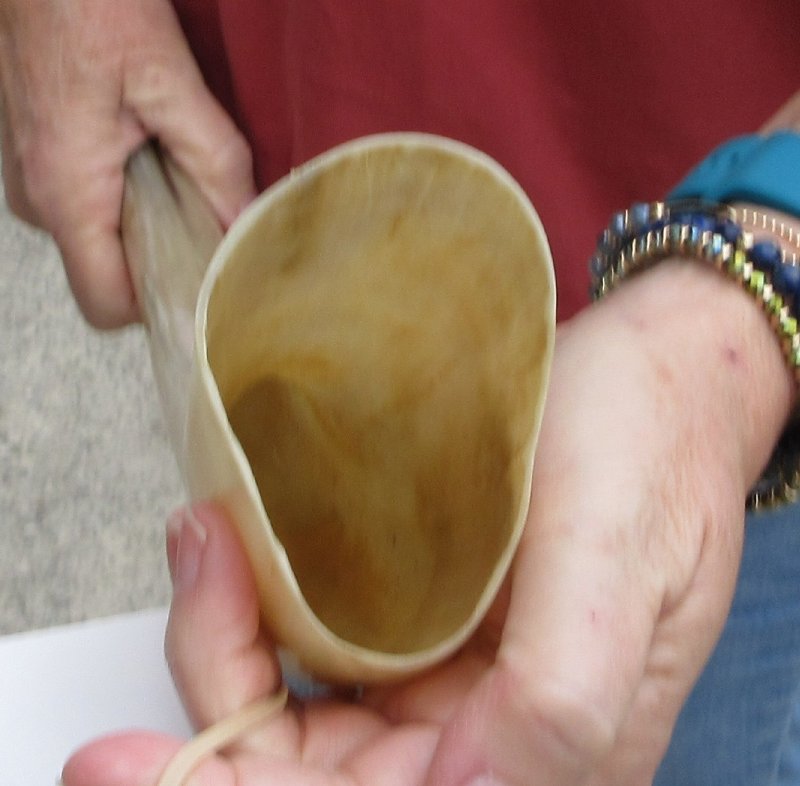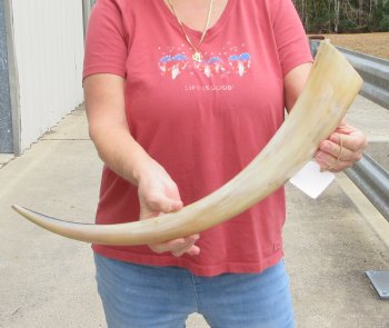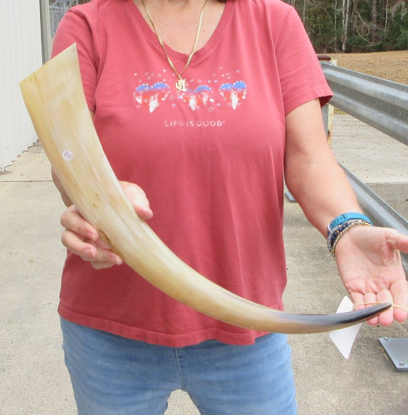 Polished Tan Cow/Cattle horn for sale, measuring approximately 24 inches, measured around the curve of the horn using a cloth tape measure not straight up and down with a ruler.  These horns do not stand unsupported.  Cow/Cattle horns vary in coloring, size and shape and are used for making animal horn jewelry, in cabin decor, rustic decor, as knife handle material and for cane handles, for carving, in the art of scrimshaw and in making inlaid instruments.