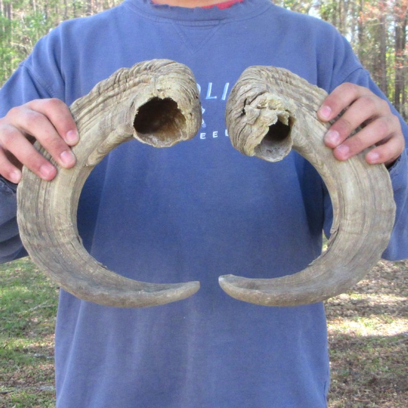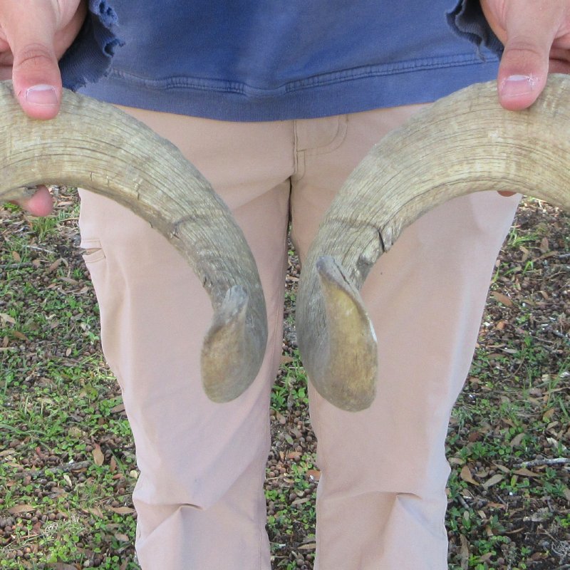 Matching pair of sheep horns or Ram horns (Ovis aries)  measuring approximately 25 and 26 inches around the curl.   Review photos. Sheep horns and ram horns are measured around the curve of the horn - not straight.  Large sheep horns will have natural imperfections including, gouges, holes, splits, missing sections of top layer, etc. from aging and fighting.   Ram horns and sheep horns are used in making blowing horns, furniture legs, lamps, sconces, knife handles, cane handles, inlaid crafts and numerous other taxidermy crafts. Our ram sheep horns are a by-product of the farming industry and Government culling programs. The ram sheep horns have been professionally cleaned in Africa and India and cleared for entry into the United States by the U.S. Fish and Wildlife Service and U.S. Customs.