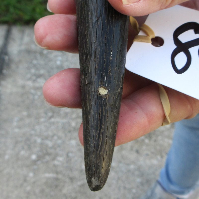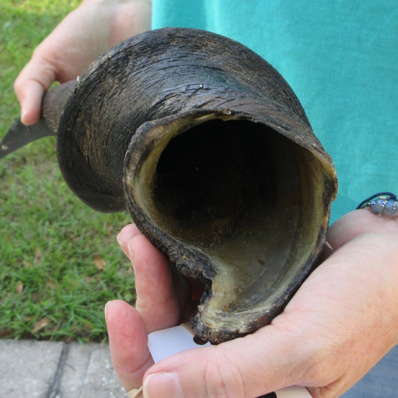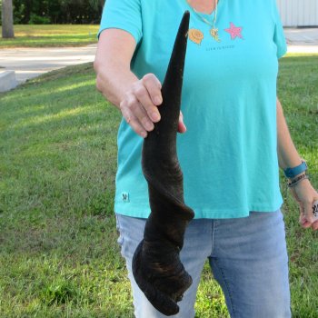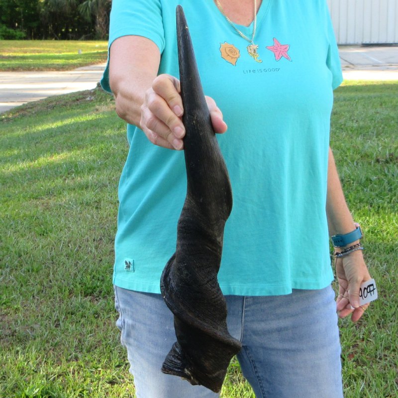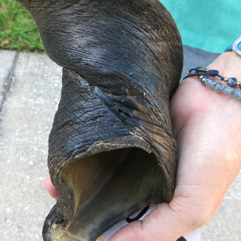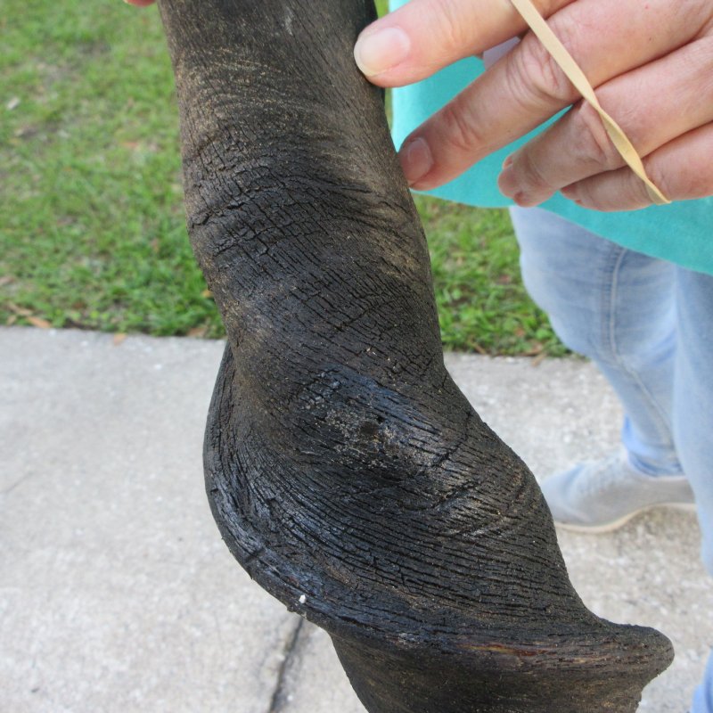 B-Grade Male Eland horn (Taurotragus oryx), measured around the curl, imported from South Africa. This eland bull horn measures approximately 25 inches (measured around the curl of the horn with a cloth tape measure, not straight up and down with a ruler).    Gouge and putty filled drill holes. Review all photos.  Eland horns are used in making blowing horns, eland horn instruments, furniture legs, lamps, sconces, knife handles, cane handles, inlaid crafts and numerous other taxidermy crafts.