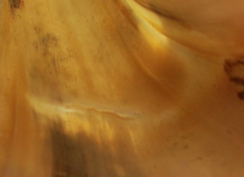 Tan Cow/Cattle horn for sale, measuring approximately 25 inches, measured around the curve of the horn using a cloth tape measure not straight up and down with a ruler.  These horns do not stand unsupported. Indentation - review photos. Cow/Cattle horns vary in coloring, size and shape and are used for making animal horn jewelry, in cabin decor, rustic decor, as knife handle material and for cane handles, for carving, in the art of scrimshaw and in making inlaid instruments.