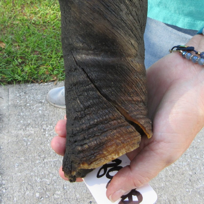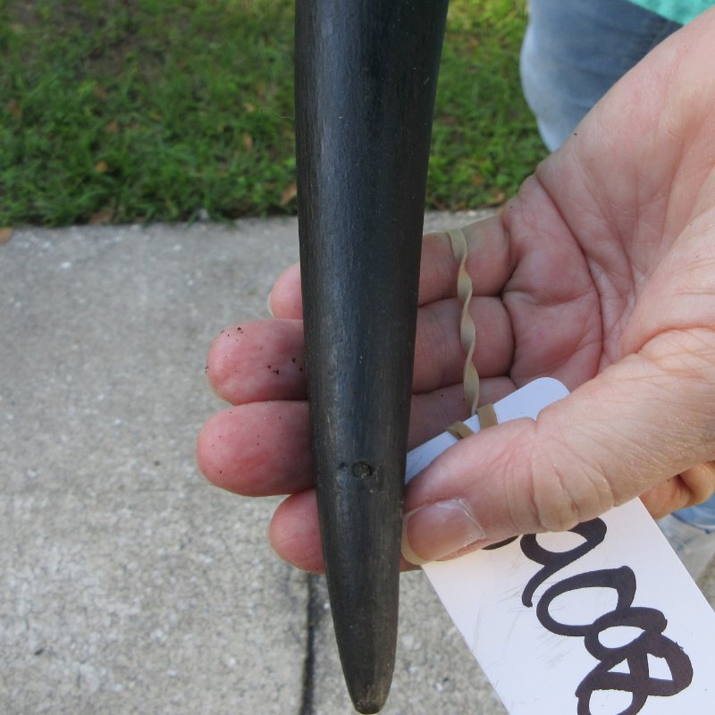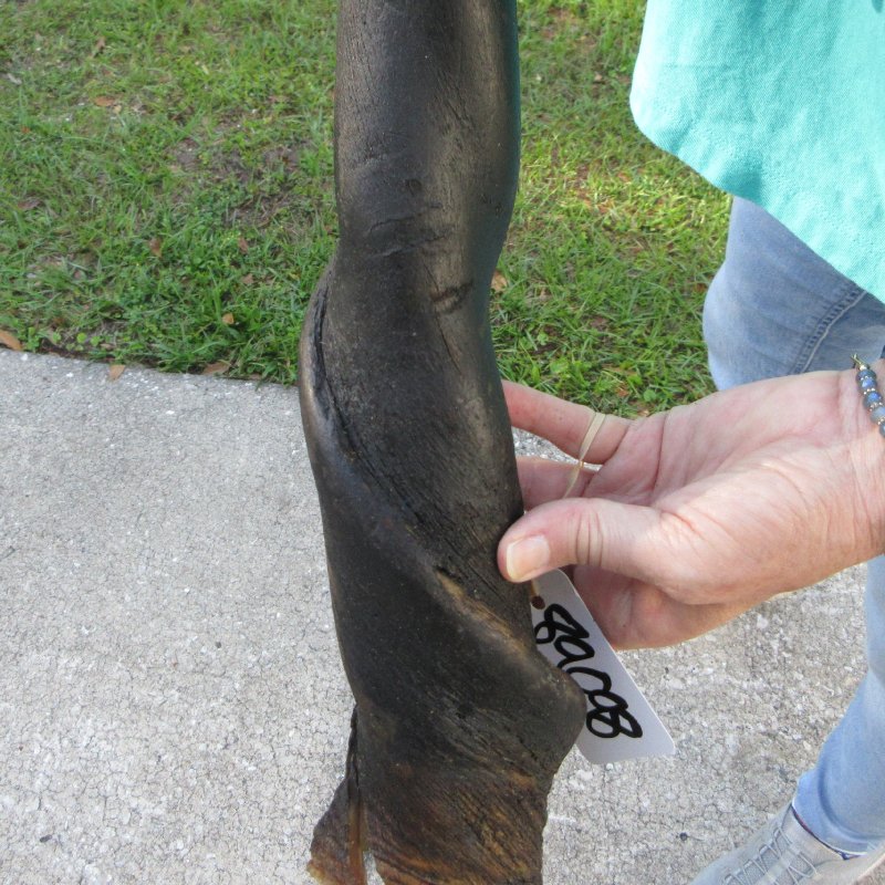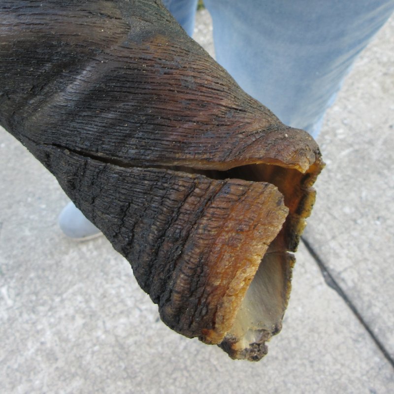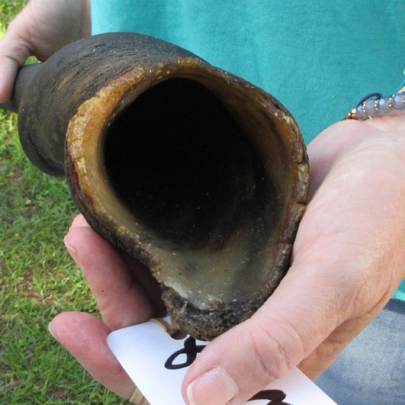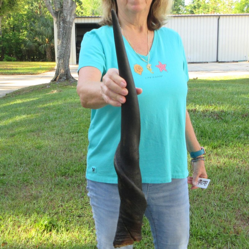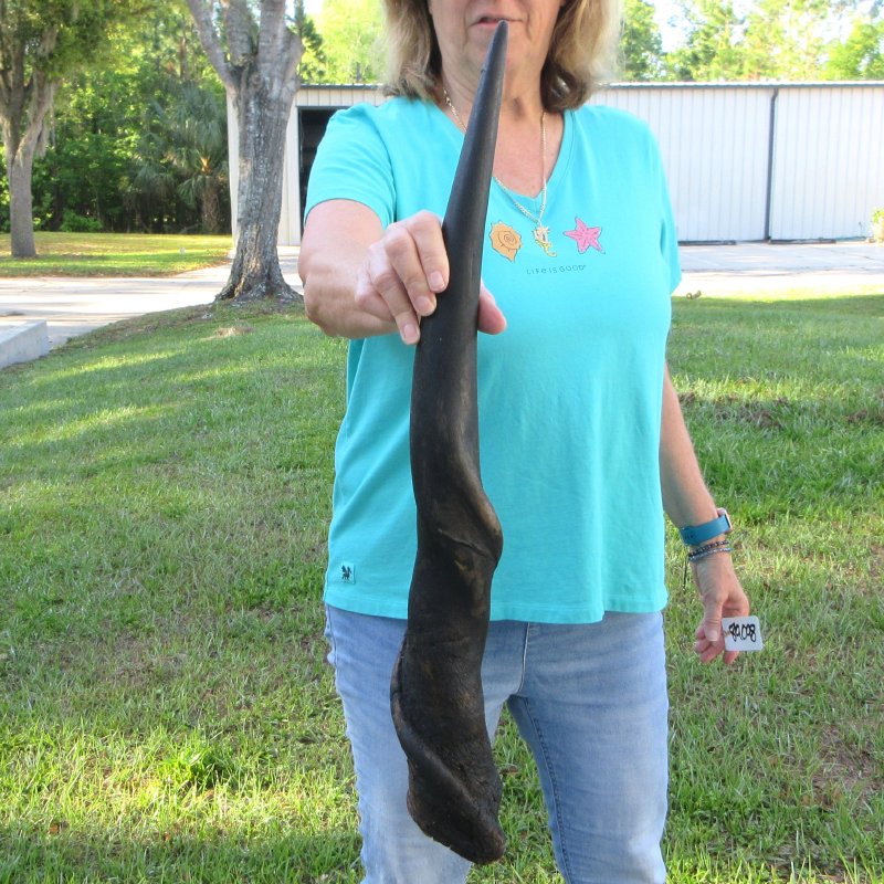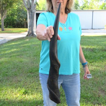 B-Grade Male Eland horn (Taurotragus oryx), measured around the curl, imported from South Africa. This eland bull horn measures approximately 26-1/2 inches (measured around the curl of the horn with a cloth tape measure, not straight up and down with a ruler). Split through base of horn, gouge, and putty filled drill holes. Review all photos. Eland horns are used in making blowing horns, eland horn instruments, furniture legs, lamps, sconces, knife handles, cane handles, inlaid crafts and numerous other taxidermy crafts.