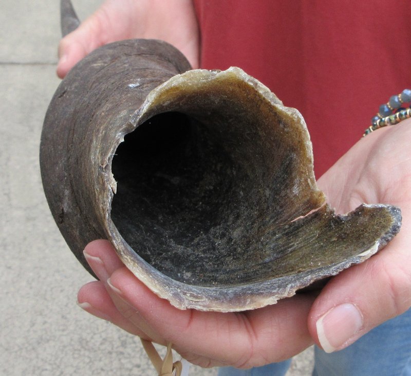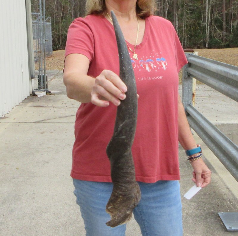 B-Grade Male Eland horn (Taurotragus oryx), measured around the curl, imported from South Africa. This eland bull horn measures approximately 27 inches (measured around the curl of the horn with a cloth tape measure, not straight up and down with a ruler).    Review all photos.  Eland horns are used in making shofars, blowing horns, eland horn instruments, furniture legs, lamps, sconces, knife handles, cane handles, inlaid crafts and numerous other taxidermy crafts.