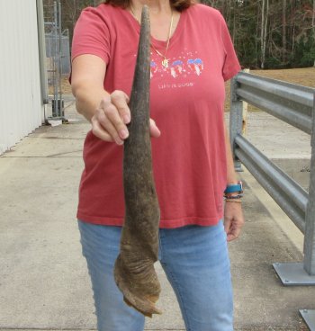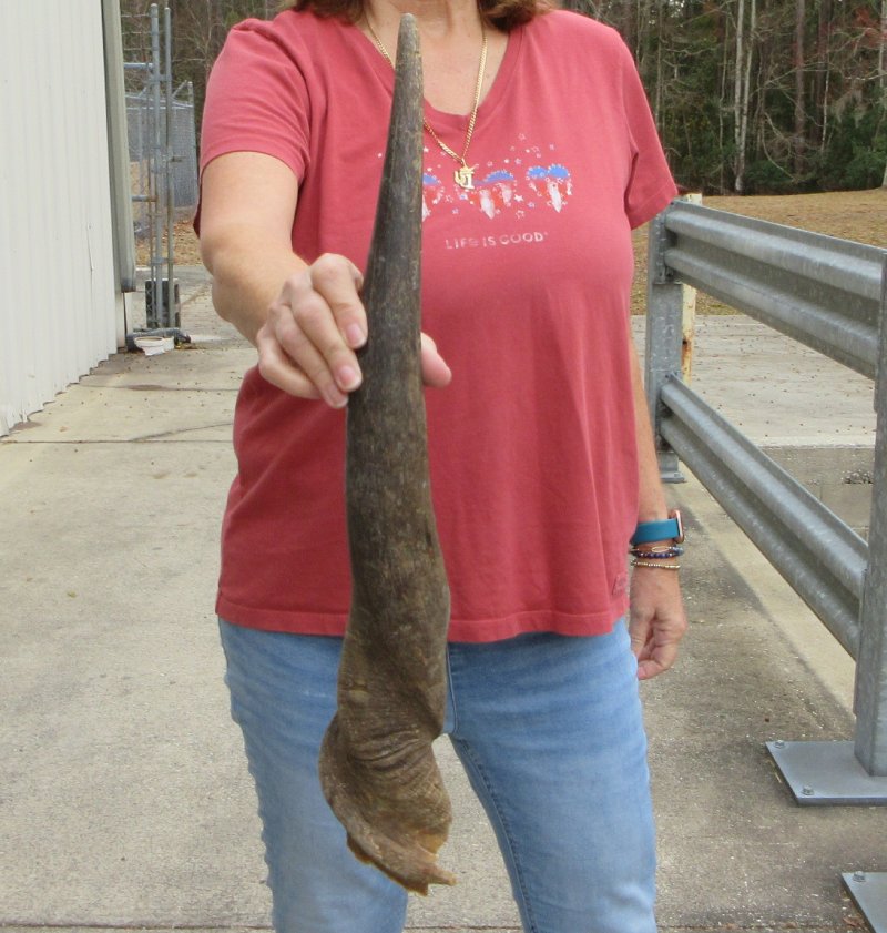 B-Grade Male Eland horn (Taurotragus oryx), measured around the curl, imported from South Africa. This eland bull horn measures approximately 27 inches (measured around the curl of the horn with a cloth tape measure, not straight up and down with a ruler).    Review all photos.  Eland horns are used in making shofars, blowing horns, eland horn instruments, furniture legs, lamps, sconces, knife handles, cane handles, inlaid crafts and numerous other taxidermy crafts.