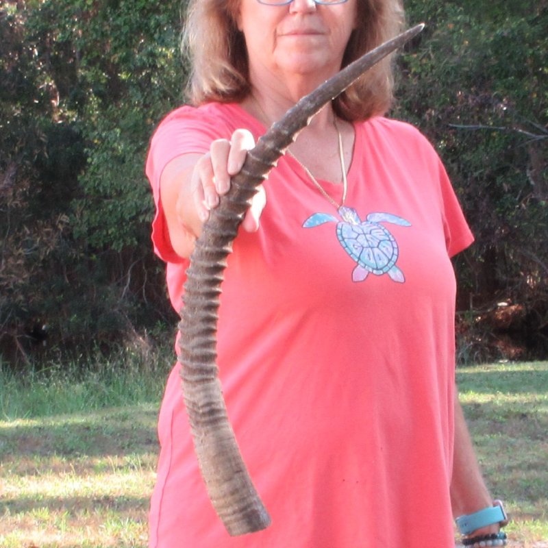 Female African Sable Horn (Hippotragus niger) for sale, measuring approximately 27 inches, measured around the curve of the horns, using a cloth tape measure -- not straight with a wood ruler. Review all photos. You will receive the horn shown in the photoAll of our horns are commercial grade and imperfect. They will have imperfections due to the natural aging process and living in the wild--scars, blemishes, rub areas, broken or missing teeth, bug bite marks, etc. This horn was cleared by the U.S Fish and Wildlife Services and U.S Customs Services for legal entry into the United States. It was obtained from the African Government's Culling Program.