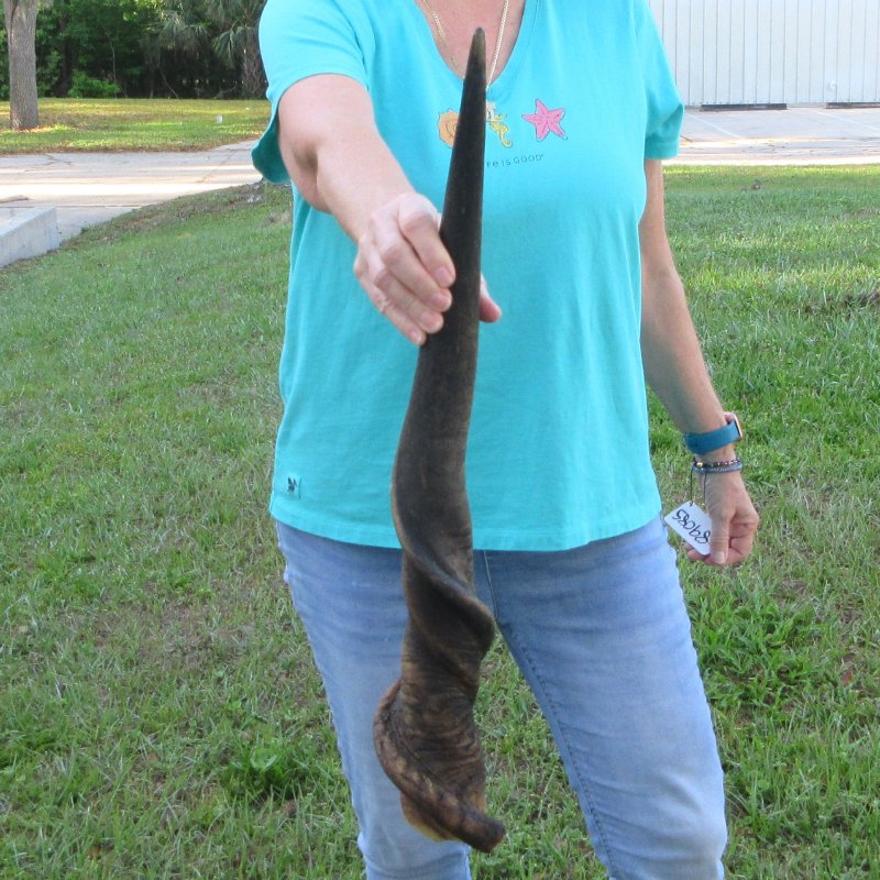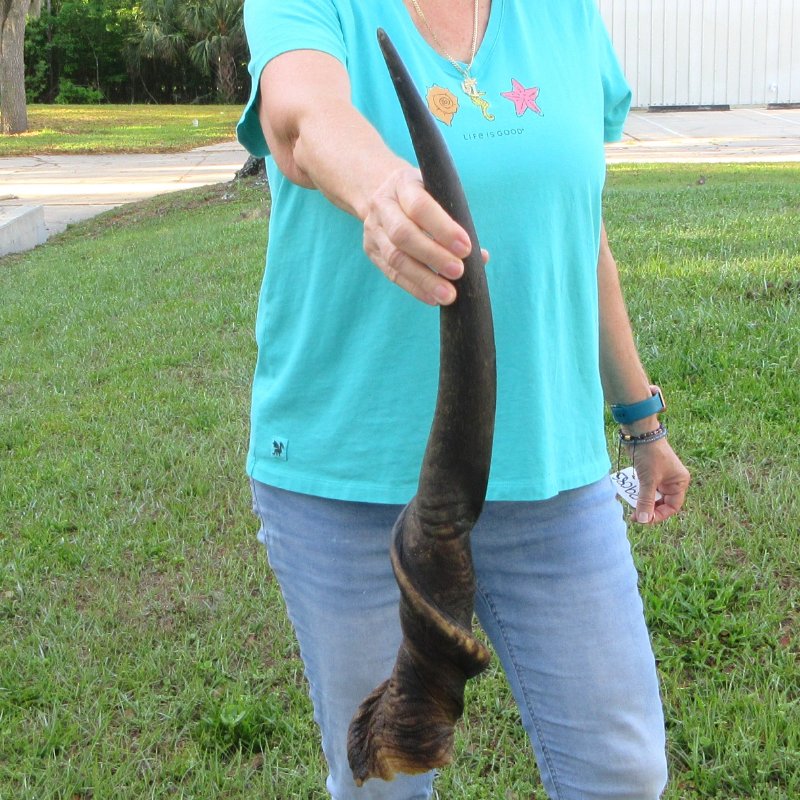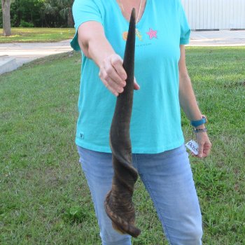 Male Eland horn (Taurotragus oryx), measured around the curl, imported from South Africa. This eland bull horn measures approximately 27 inches (measured around the curl of the horn with a cloth tape measure, not straight up and down with a ruler). Split at base of horn. Review all photos. Eland horns are used in making shofars, blowing horns, eland horn instruments, furniture legs, lamps, sconces, knife handles, cane handles, inlaid crafts and numerous other taxidermy crafts.