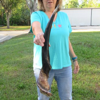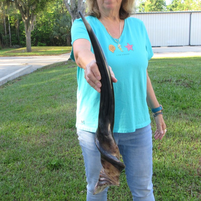 Polished Male Eland horn (Taurotragus oryx), measured around the curl, imported from South Africa. This eland horn measures approximately 28-1/2 inches long (measured around the curl of the horn with a cloth tape measure, not up and down with a ruler).  - Review all photos.  Eland horns are used in making shofars, blowing horns, eland horn instruments, furniture legs, lamps, sconces, knife handles, cane handles, inlaid crafts and numerous other taxidermy crafts.