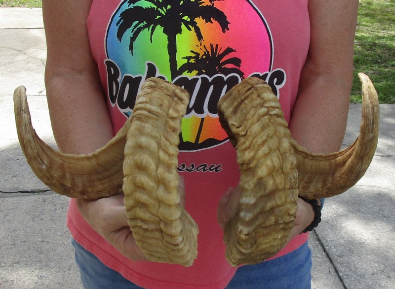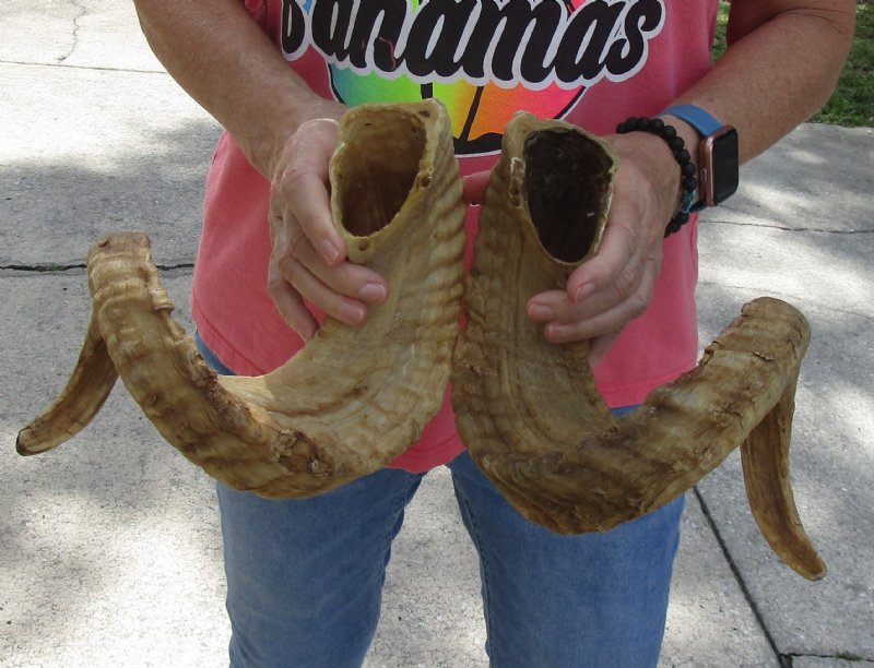 Matching pair of sheep horns or Ram horns (Ovis aries)  measuring approximately 28 and 29 inches around the curl.   Review photos. Sheep horns and ram horns are measured around the curve of the horn - not straight.  Large sheep horns will have natural imperfections including, gouges, holes, splits, missing sections of top layer, etc. from aging and fighting.   Ram horns and sheep horns are used in making blowing horns, furniture legs, lamps, sconces, knife handles, cane handles, inlaid crafts and numerous other taxidermy crafts. Our ram sheep horns are a by-product of the farming industry and Government culling programs. The ram sheep horns have been professionally cleaned in Africa and India and cleared for entry into the United States by the U.S. Fish and Wildlife Service and U.S. Customs.