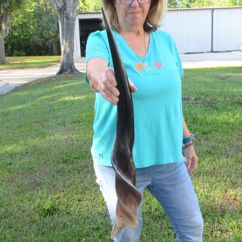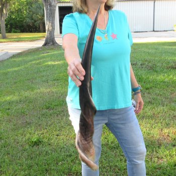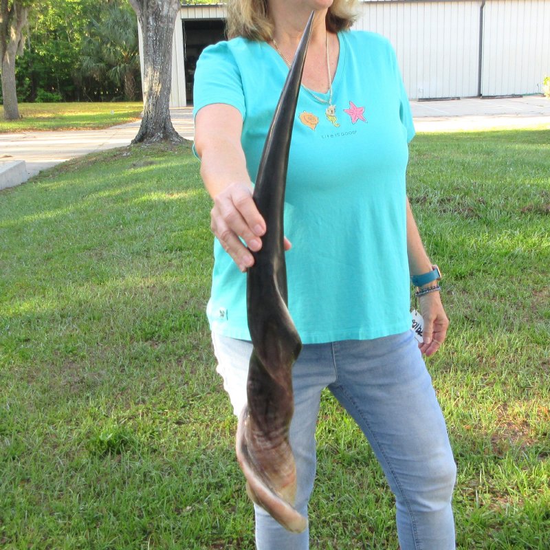 Polished Male Eland horn (Taurotragus oryx), measured around the curl, imported from South Africa. This eland horn measures approximately 29 inches long (measured around the curl of the horn with a cloth tape measure, not up and down with a ruler).  - Review all photos.  Eland horns are used in making shofars, blowing horns, eland horn instruments, furniture legs, lamps, sconces, knife handles, cane handles, inlaid crafts and numerous other taxidermy crafts.