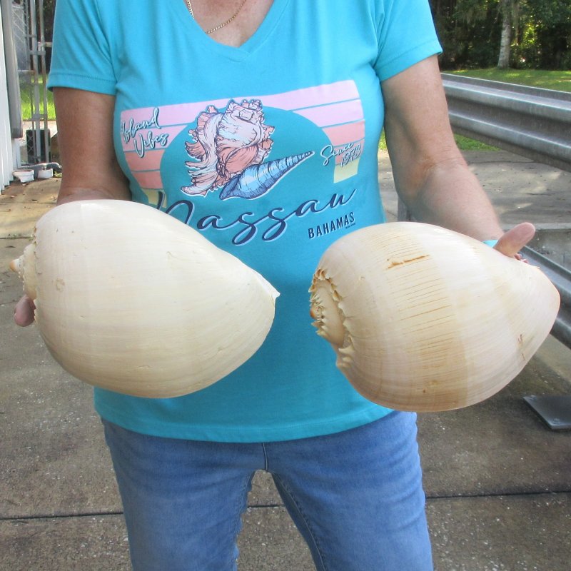 Two Philippine Crowned Baler Melon Shells called crowned baler, melo aethiopica measuring approximately 10 inches long.  These two Philippine melon shells, crowned baler shells have a large mouth opening perfect for making seashell wedding centerpieces. Large shells are perfect for nautical home decorating and display. - Review all photos.
