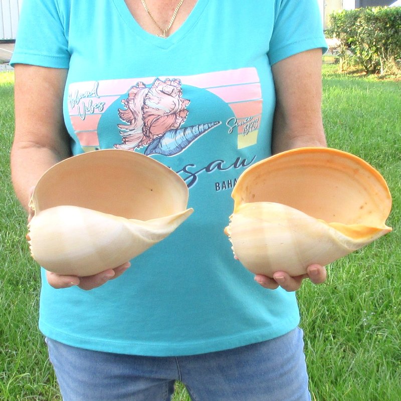 Two Philippine Crowned Baler Melon Shells called crowned baler, melo aethiopica measuring approximately 8 inches long.  These two Philippine melon shells, crowned baler shells have a large mouth opening perfect for making seashell wedding centerpieces. Large shells are perfect for nautical home decorating and display. - Review all photos.