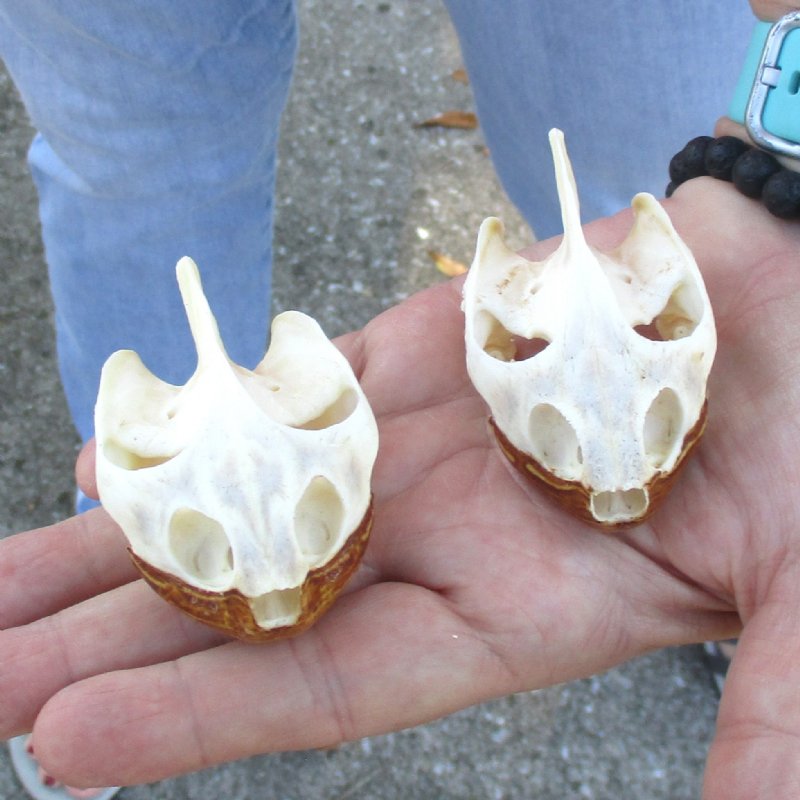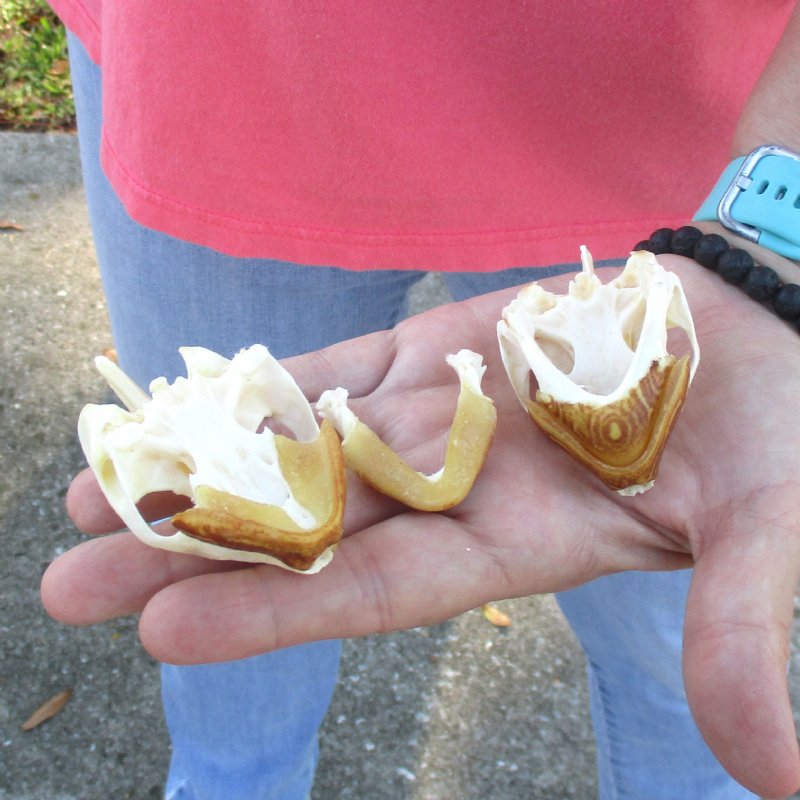 2pc Extra Large Map Turtle skull measuring approximately 2-3/4 inches long and 1-3/4 inches wide. Turtle skulls can be used in Native American crafts. Map turtles follow the general body plan of the  more common sliders and painted turtles. - Review photos. However, unlike those turtles, most Map turtles have a well-defined keel running down the middle of the carapace. In a number of species this keel also has rather large knobs or spines jutting upward or backward.  This feature is responsible for the Map turtles other common name: Sawback turtles.
