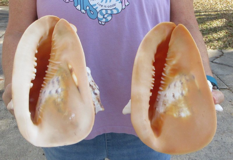 Two Piece lot of Yellow Helmet Shells, Horned Helmet Shells, Cassis cornuta. These are large seashells used in coastal home decorating. Both of these shells measure approximately 8 inches long.   Yellow helmet shells, also called horned helmet shells are found in the Indo-Pacific. Helmet shells, horned helmet shells, live mostly in warm waters around the world. These yellow helmet shells, also called horned helmet shells or cassis cornuta are beautiful peach colored shells. These are real shells - not  replicas.  They will have some imperfections (chips, calcium, rough spots, broken tips, etc.) from living in the oceans and aging.