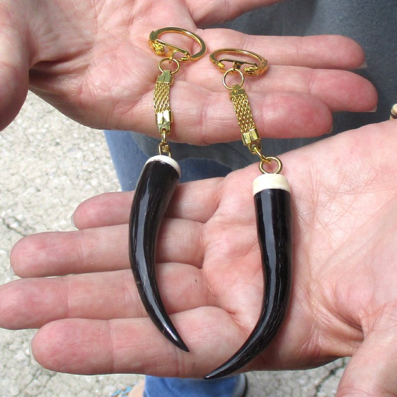 2pc lot of Polished African Female springbok horn key rings, or key chains for sale.  Our female springbok horn key rings come with a 2-3/4 inch long gold colored key chain attached.  These female springbok horns measure approximately 3 inches from the top of the horn to the bottom of the horn (not including the cap), measured along the curve with a cloth tape measure.