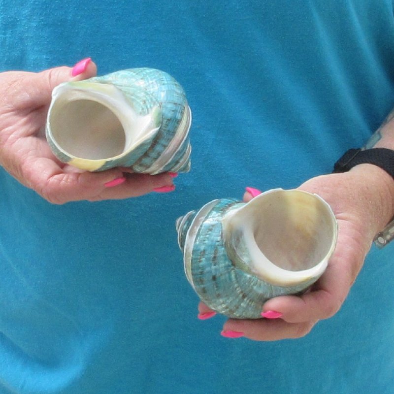 This is a 2 piece lot of polished jade turbo with pearl band shells for sale. These turbo shells measure approximately 4 inches. Pearl banded turbos are thick and durable. You can use these beautiful shells in coastal home decorating and are perfect for use in shell baskets, glass containers and for collectors and seashell decorating.  They are also great for hermit crabs.