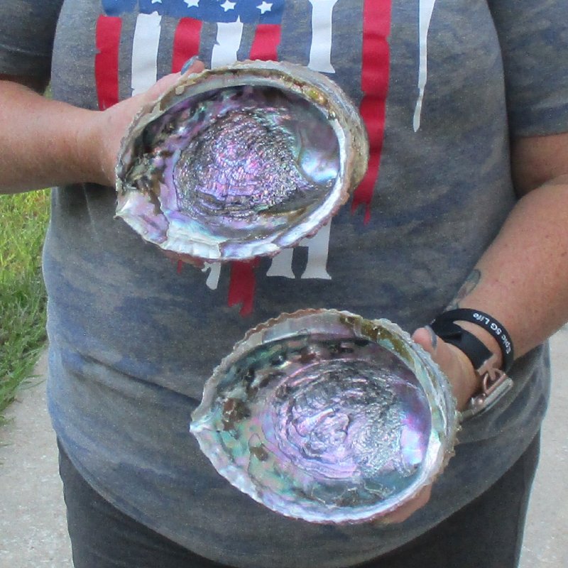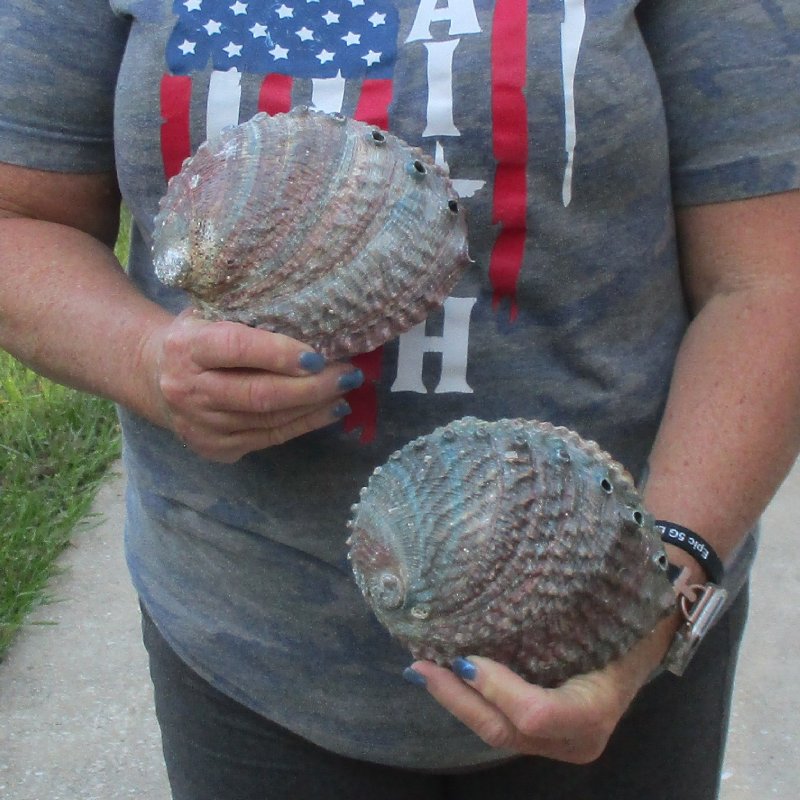 2pc Pink Abalone shells for sale, Haliotis corrugata, commercial grade with natural imperfections,  have a highly corrugated shell margin. Because of this they have an alternate name, the corrugated abalone. These pink abalone each measure approximately 6 inches in size. - Review photos. Abalone have been used in this area since man was first here. The native Americans ate the abalone meat, used the whole shells as bowls, pieces of the shells for fish hooks, scrapers, beads, necklaces and decorations, and even bartered with the shells.