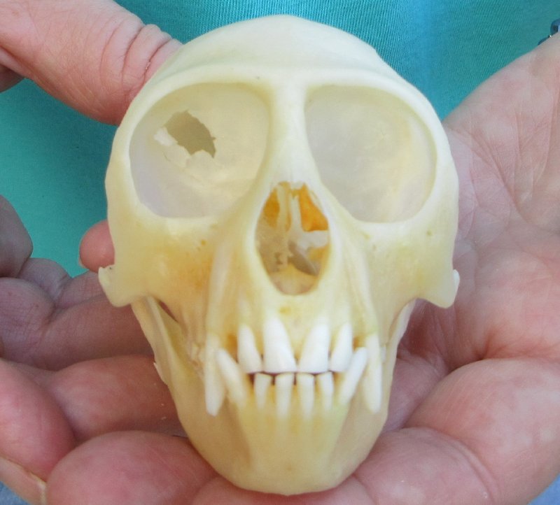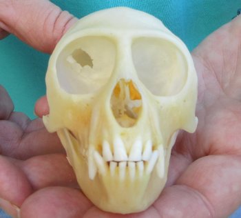 Female African Vervet Monkey Skull (Chlorocebus pygerythrus) for salemeasuring approximately 3-1/2 inches long and 2 inches wide.   Review all photos.  All of our monkey skulls are commercial grade and imperfect. They will have imperfections due to the natural aging process and living in the wild--scars, blemishes, rub areas, broken or missing teeth, bug bite marks, etc. This vervet monkey skull was professionally cleaned and cleared by the U.S Fish and Wildlife Services and U.S Customs Services for legal entry into the United States. These were obtained from the African Government's Culling Program.