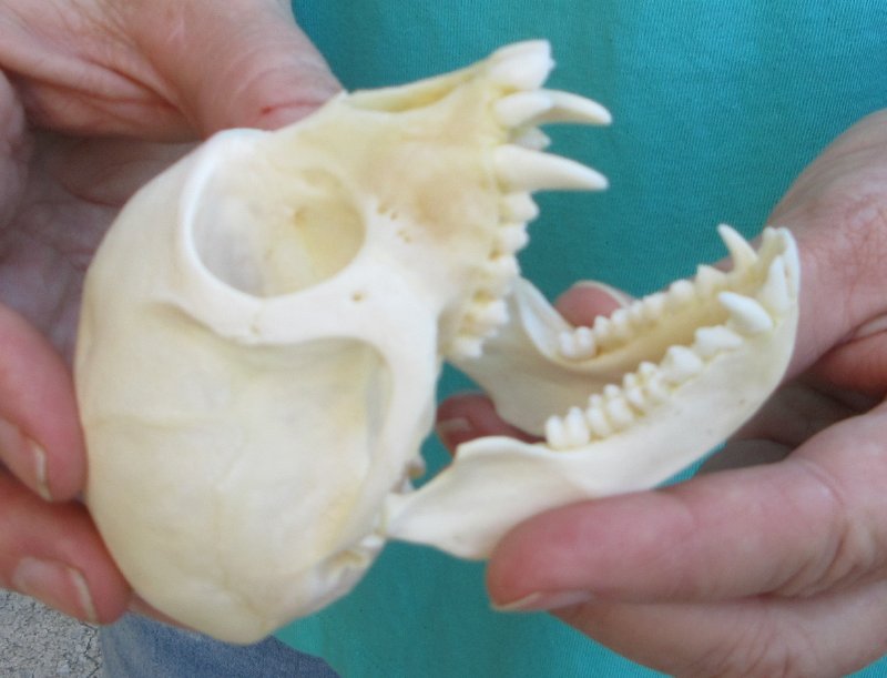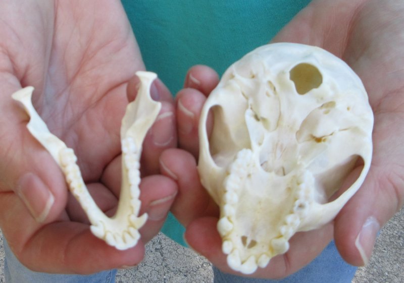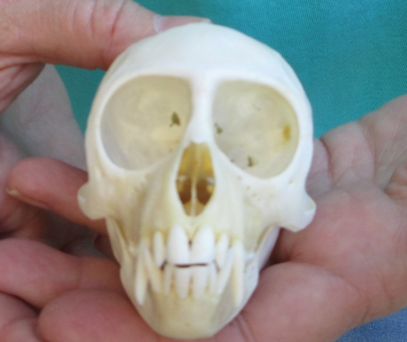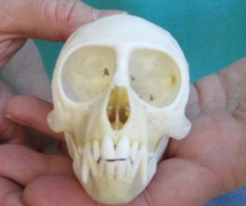 Female African Vervet Monkey Skull (Chlorocebus pygerythrus) for salemeasuring approximately 3-1/2 inches long and 2 inches wide.   Review all photos.  All of our monkey skulls are commercial grade and imperfect. They will have imperfections due to the natural aging process and living in the wild--scars, blemishes, rub areas, broken or missing teeth, bug bite marks, etc. This vervet monkey skull was professionally cleaned and cleared by the U.S Fish and Wildlife Services and U.S Customs Services for legal entry into the United States. These were obtained from the African Government's Culling Program.