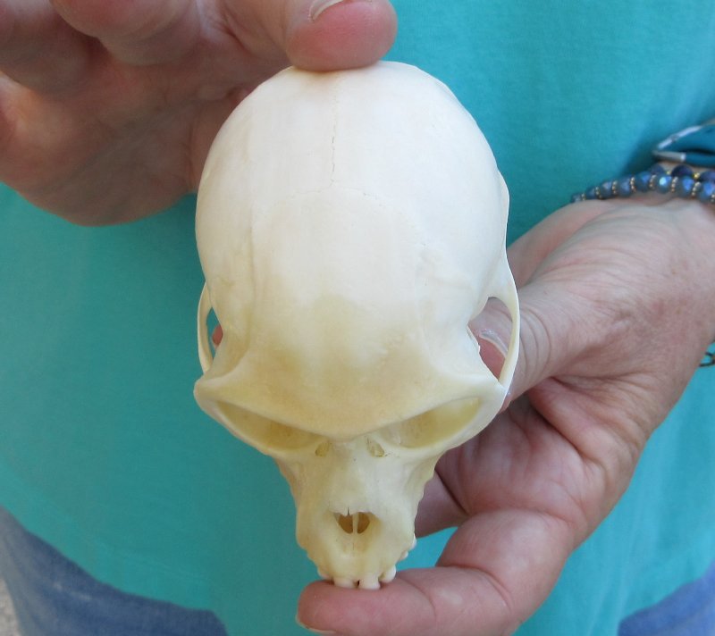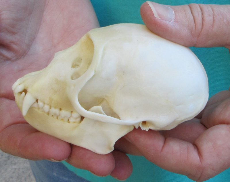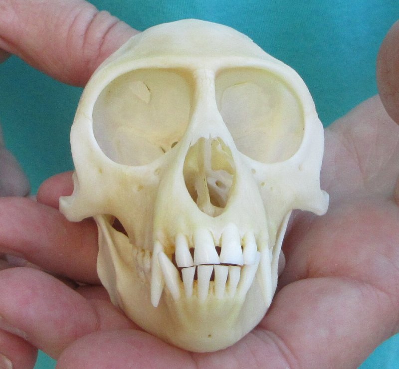 Female African Vervet Monkey Skull (Chlorocebus pygerythrus) for salemeasuring approximately 3-3/4 inches long and 2-1/4 inches wide.   Review all photos.  All of our monkey skulls are commercial grade and imperfect. They will have imperfections due to the natural aging process and living in the wild--scars, blemishes, rub areas, broken or missing teeth, bug bite marks, etc. This vervet monkey skull was professionally cleaned and cleared by the U.S Fish and Wildlife Services and U.S Customs Services for legal entry into the United States. These were obtained from the African Government's Culling Program.