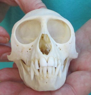 Female African Vervet Monkey Skull (Chlorocebus pygerythrus) for salemeasuring approximately 3-3/4 inches long and 2-1/4 inches wide.   Review all photos.  All of our monkey skulls are commercial grade and imperfect. They will have imperfections due to the natural aging process and living in the wild--scars, blemishes, rub areas, broken or missing teeth, bug bite marks, etc. This vervet monkey skull was professionally cleaned and cleared by the U.S Fish and Wildlife Services and U.S Customs Services for legal entry into the United States. These were obtained from the African Government's Culling Program.