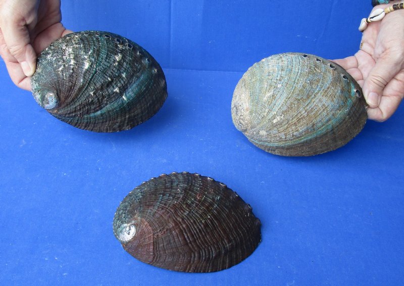 3 pc lot of Natural Green Abalone shells, commercial grade with natural imperfections. These 3 shells measure approximately 5 to 5-3/4 inches.  The larger the shell, the older it is and it will have more imperfections from aging and living in the oceans.