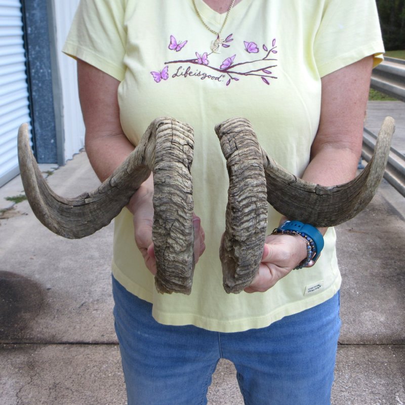 Matching pair of sheep horns or Ram horns (Ovis aries)  measuring approximately 30 inches around the curl.  Gouges, missing piece, and splits. Review photos. Sheep horns and ram horns are measured around the curve of the horn - not straight.  Large sheep horns will have natural imperfections including, gouges, holes, splits, missing sections of top layer, etc. from aging and fighting.   Ram horns and sheep horns are used in making blowing horns, furniture legs, lamps, sconces, knife handles, cane handles, inlaid crafts and numerous other taxidermy crafts. Our ram sheep horns are a by-product of the farming industry and Government culling programs. The ram sheep horns have been professionally cleaned in Africa and India and cleared for entry into the United States by the U.S. Fish and Wildlife Service and U.S. Customs.