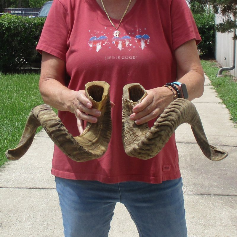 Matching pair of sheep horns or Ram horns (Ovis aries) measuring approximately 31 & 33 inches around the curl. Sheep horns and ram horns are measured around the curve of the horn - not straight. (Large sheep horns will have natural imperfections including, gouges, holes, splits, missing sections of top layer, etc. from aging and fighting. This horn has damage to tip of horn. Review all photos carefully).