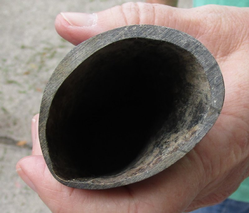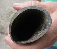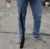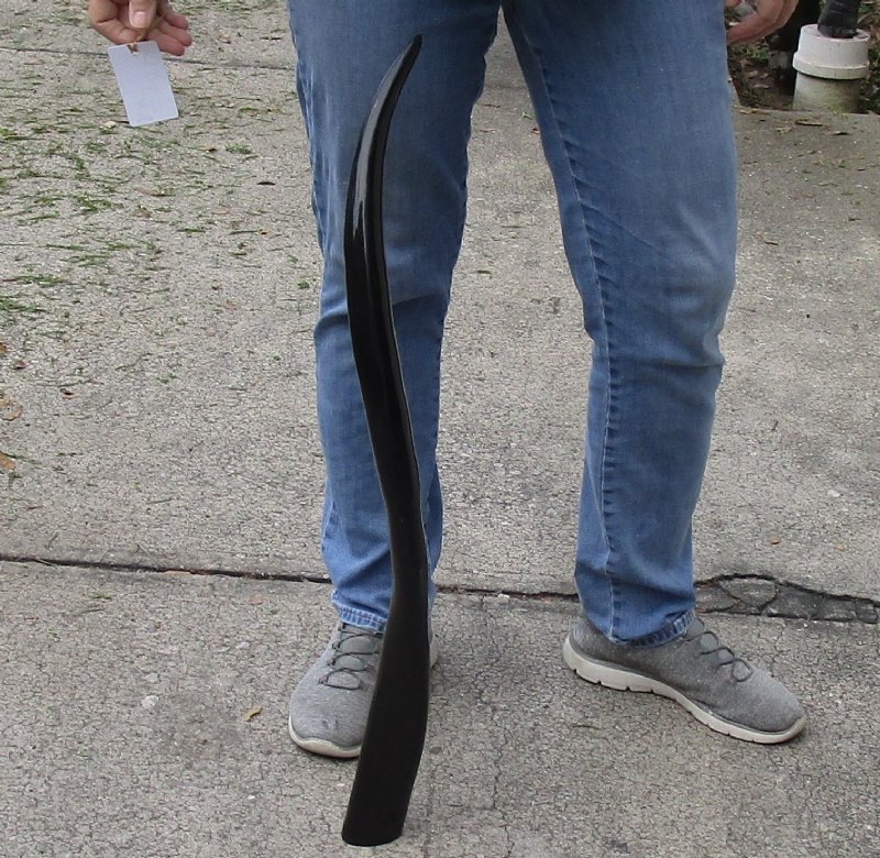Polished buffalo horn from an Indian water buffalo, Bubalus bubalis, measuring approximately 32 inches, measured around the curve of the horn using a cloth tape measure. Sticky residue. Buffalo horns vary in coloring, size and shape and are used for making animal horn jewelry, in cabin decor, rustic decor, as knife handle material and for cane handles, for carving, in the art of scrimshaw and in making inlaid instruments.