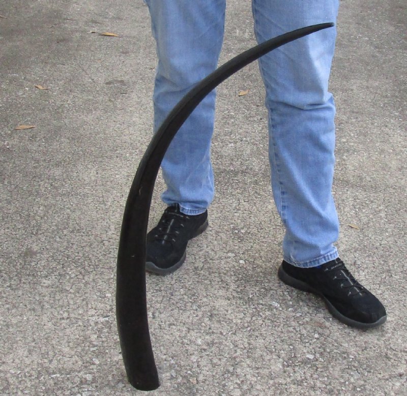 Polished buffalo horn from an Indian water buffalo, Bubalus bubalis, measuring approximately 33 inches, measured around the curve of the horn using a cloth tape measure. Sticky residueBuffalo horns vary in coloring, size and shape and are used for making animal horn jewelry, in cabin decor, rustic decor, as knife handle material and for cane handles, for carving, in the art of scrimshaw and in making inlaid instruments.
