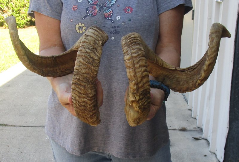 Matching pair of sheep horns or Ram horns (Ovis aries) measuring approximately 34 & 31 inches around the curl. Sheep horns and ram horns are measured around the curve of the horn - not straight. (Large sheep horns will have natural imperfections including, gouges, holes, splits, missing sections of top layer, etc. from aging and fighting. Review all photos carefully).