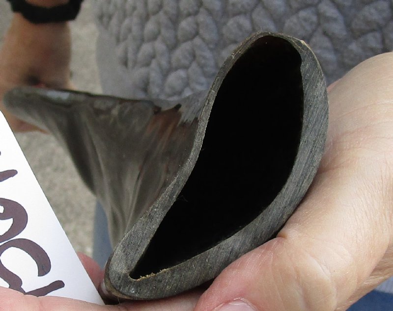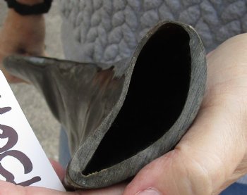 Polished buffalo horn from an Indian water buffalo, Bubalus bubalis, measuring approximately 34 inches, measured around the curve of the horn using a cloth tape measure. Sticky residue. Buffalo horns vary in coloring, size and shape and are used for making animal horn jewelry, in cabin decor, rustic decor, as knife handle material and for cane handles, for carving, in the art of scrimshaw and in making inlaid instruments.