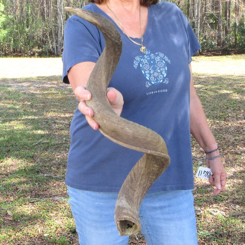 B-Grade Kudu Horn (Tragelaphus strepsiceros) imported from South Africa, measuring approximately 35 inches. -  Rough horns, gouge and split. Review photos. You will receive the horn shown in the photo. All horns are measured around the curve of the horn using a cloth tape measureAll of our horns are commercial grade and imperfect. They will have imperfections due to the natural aging process and living in the wild--scars, blemishes, rub areas, etc. This horn was cleared by the U.S Fish and Wildlife Services and U.S Customs Services for legal entry into the United States. It was obtained from the African Government's Culling Program.