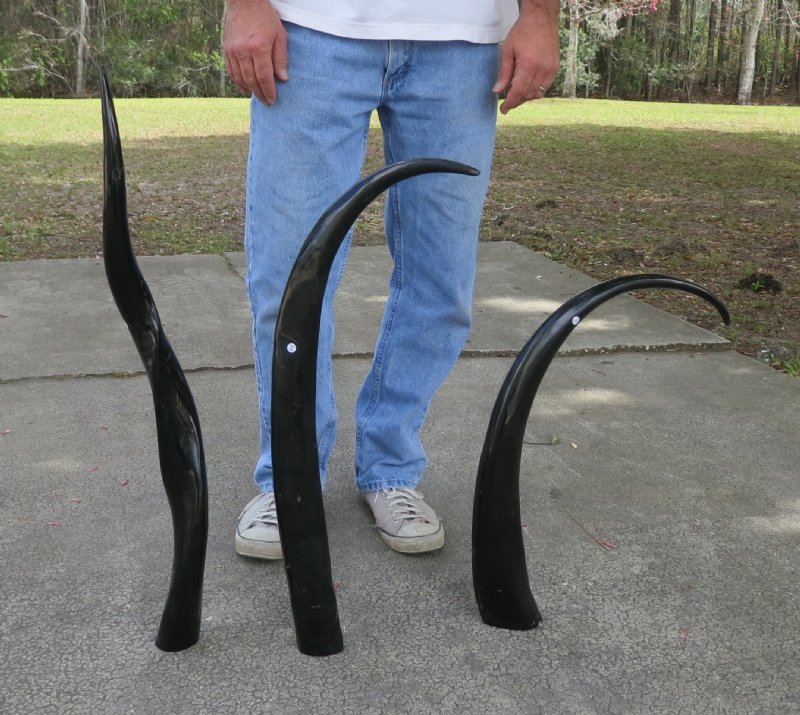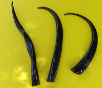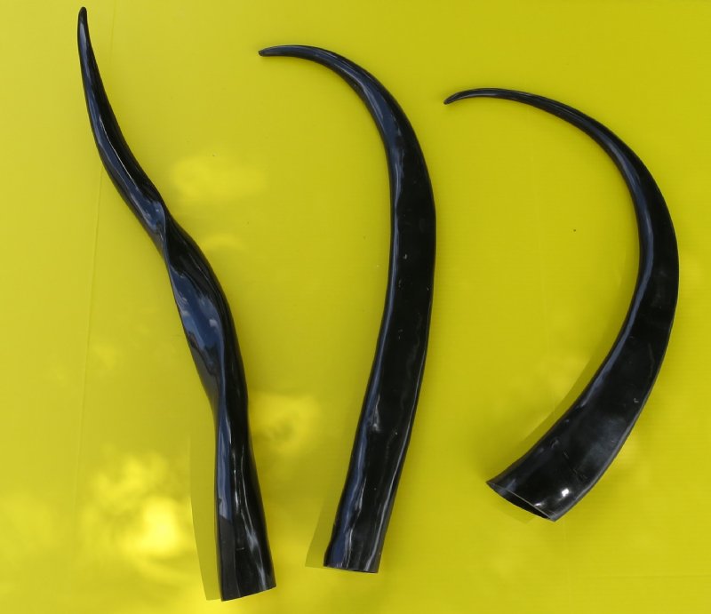 You will receive horns similiar to those shown in the photo. No two horns are identical. They will vary in coloring, shading and size. These horns are measured around the curve of the horn using a cloth tape measure -- NOT straight with a wood ruler. Some of these horns have a tiny patch at the tip of the horn where a tiny hole was drilled to release the pressure and allow removal of the inner bone.