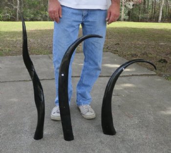 Polished Indian water buffalo horns wholesale, Bubalus bubalis, 35 inches to 38 inches are measured around the curve of the horn using a cloth tape measure. Polished buffalo horns vary in coloring, size and shape and are used for making animal horn jewelry, in cabin decor, rustic decorating, in making knife and cane handles, for carving, in the art of scrimshaw and in making inlaid instruments.