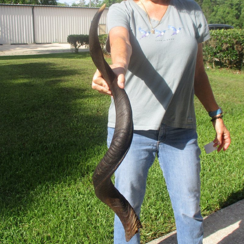 Kudu Horn for sale (Tragelaphus strepsiceros) for sale imported from South Africa, measuring approximately 37 1/2 inches -Review all photos. You will receive the horn shown in the photo. All horns are measured around the curve of the horn using a cloth tape measure. All of our horns are commercial grade and imperfect. They will have imperfections due to the natural aging process and living in the wild--scars, blemishes, rub areas, worm holes, etc. This horn was cleared by the U.S Fish and Wildlife Services and U.S Customs Services for legal entry into the United States. It was obtained from the African Government's Culling Program.
