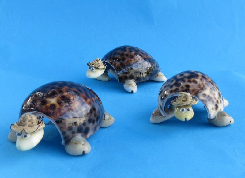 Wholesale bobbing head tiger cowry shell turtle novelty with a hat measure approximately 4 inches long by 2-1/4 inches wide and make great seashell gifts for turtle collectors. These hand crafted bobbing head tiger cowry shell turtle novelties have been carved out of a natural tiger cowrie shell and are wearing a wicker hat.